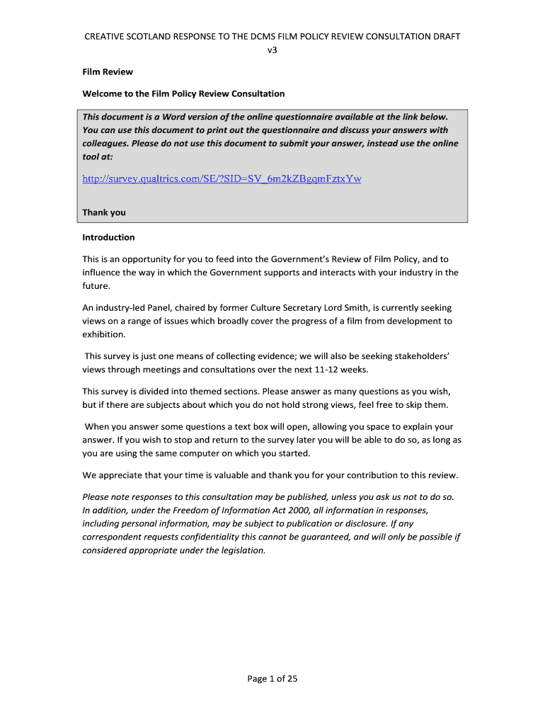 CREATIVE SCOTLAND RESPONSE TO THE DAMS FILM POLICY REVIEW CONSULTATION DRAFT v3 Film Review Welcome to the Film Policy Review Consultation This document is a Word version of the online questionnaire