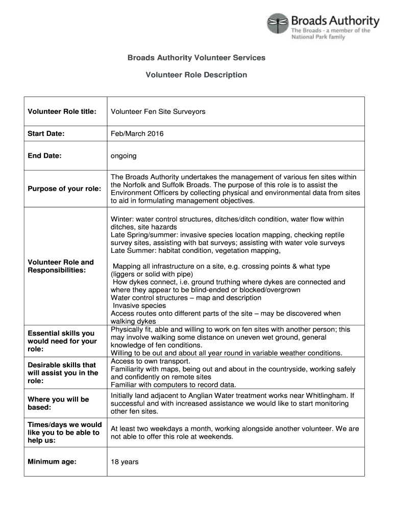 Broads Authority Volunteer Services Volunteer Role Description Volunteer Role title: Volunteer Fen Site Surveyors Start Date: Feb/March 2016 End Date: ongoing Purpose of your role: The Broads Authority