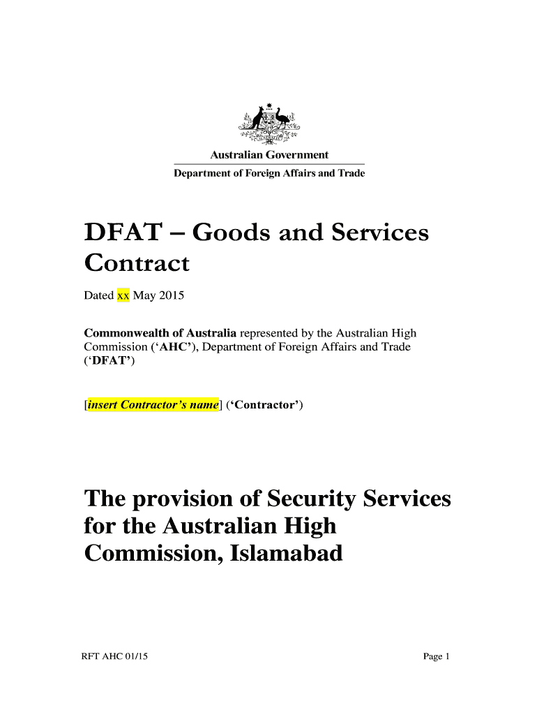 FAT Goods and Services Contract Dated xx May 2015 Commonwealth of Australia represented by the Australian High Commission (AHC), Department of Foreign Affairs and Trade (FAT) insert Contractors name
