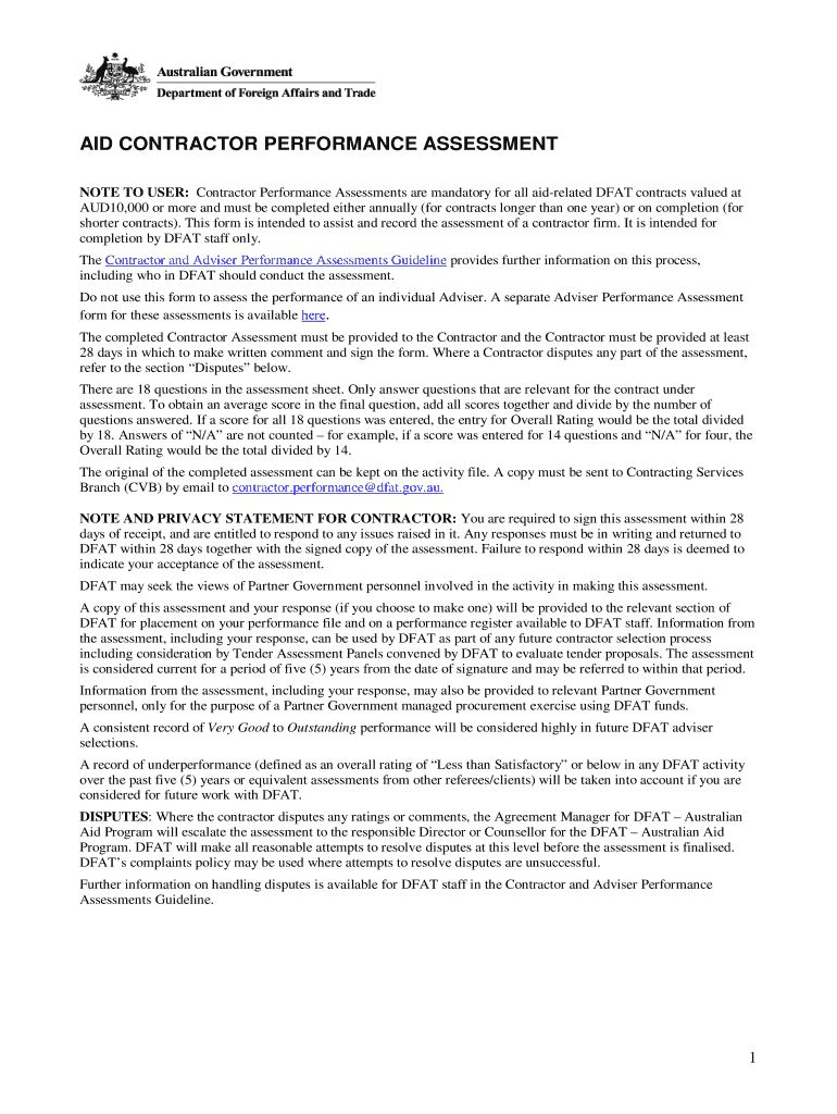 Get the free AID CONTRACTOR PERFORMANCE ASSESSMENT - dfat gov