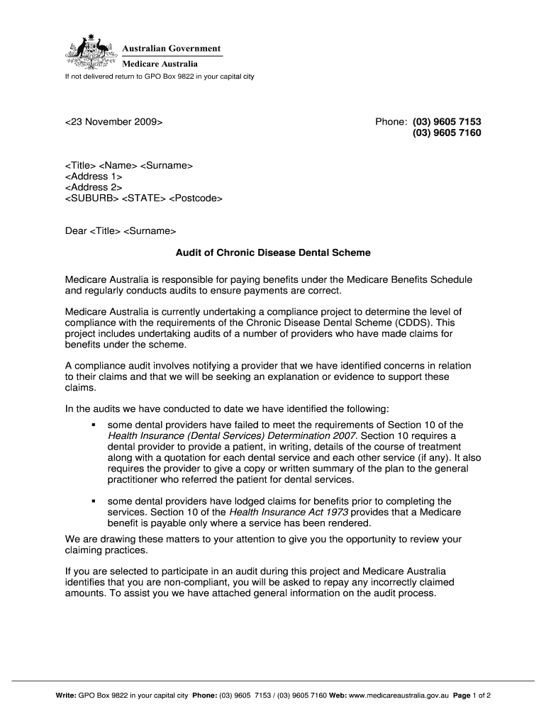 If not delivered return to GPO Box 9822 in your capital city 23 November 2009 Phone: (03) 9605 7153 (03) 9605 7160 Title Name Surname Address 1 Address 2 SUBURB STATE Postcode Dear Title Surname Audit