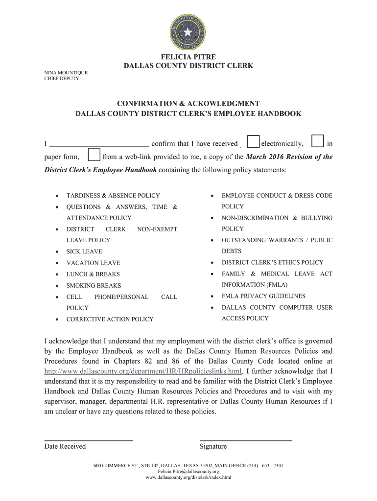 FELICIA PIRE DALLAS COUNTY DISTRICT CLERK NINA BOUTIQUE CHIEF DEPUTY CONFIRMATION & ACKNOWLEDGMENT DALLAS COUNTY DISTRICT CLERKS EMPLOYEE HANDBOOK I confirm that I have received electronically, in