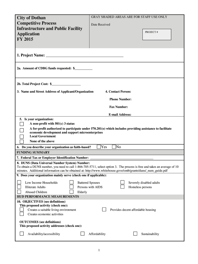 GRAY SHADED AREAS ARE FOR STAFF USE ONLY City of Dothan Competitive Process Infrastructure and Public Facility Application FY 2015 Date Received PROJECT # 1. Project Name: 2a. Amount of CBG funds