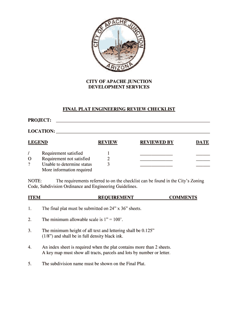 CITY OF APACHE JUNCTION DEVELOPMENT SERVICES FINAL PLAT ENGINEERING REVIEW CHECKLIST PROJECT: LOCATION: LEGEND / O ? Requirement satisfied Requirement not satisfied Unable to determine status More