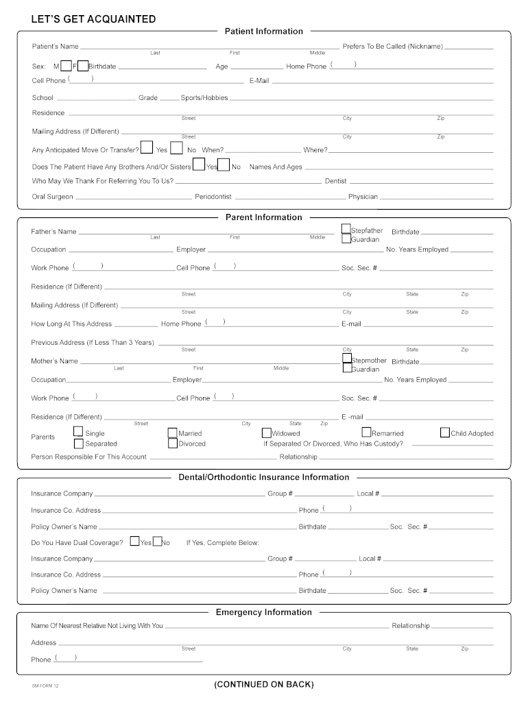 LETS's GET ACQUAINTED Patient Information Patients Name Sex: M F Cell Phone (Last First Birthdate Middle Prefers To Be Called (Nickname) Home Phone (Age)) Email School Grade Sports/Hobbies Residence