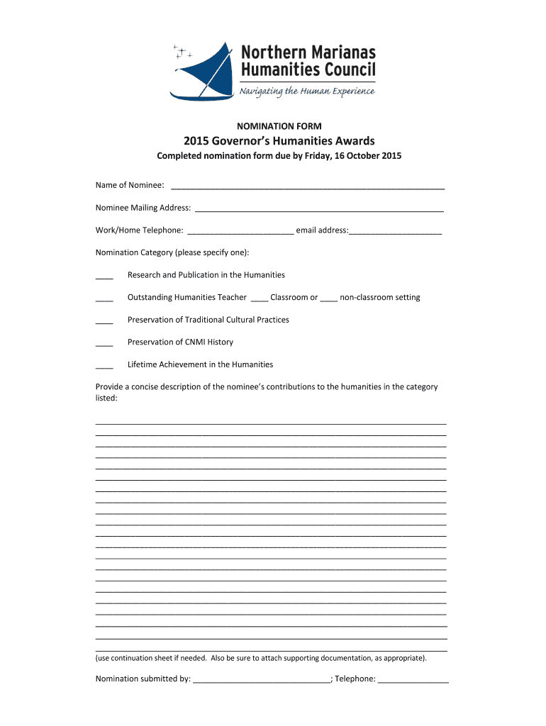 Get the free NOMINATION FORM 5 Governors Humanities Awards - northernmarianashumanities