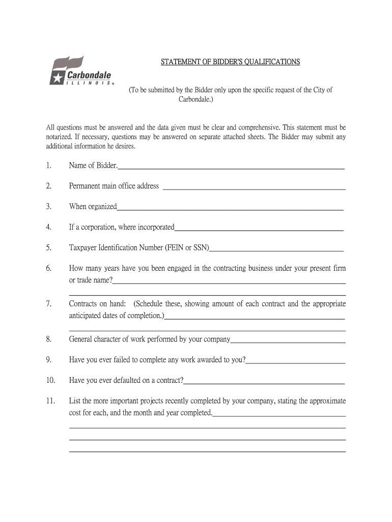 STATEMENT OF BIDDER IS QUALIFICATIONS (To be submitted by the Bidder only upon the specific request of the City of Carbondale.) All questions must be answered and the data given must be clear and