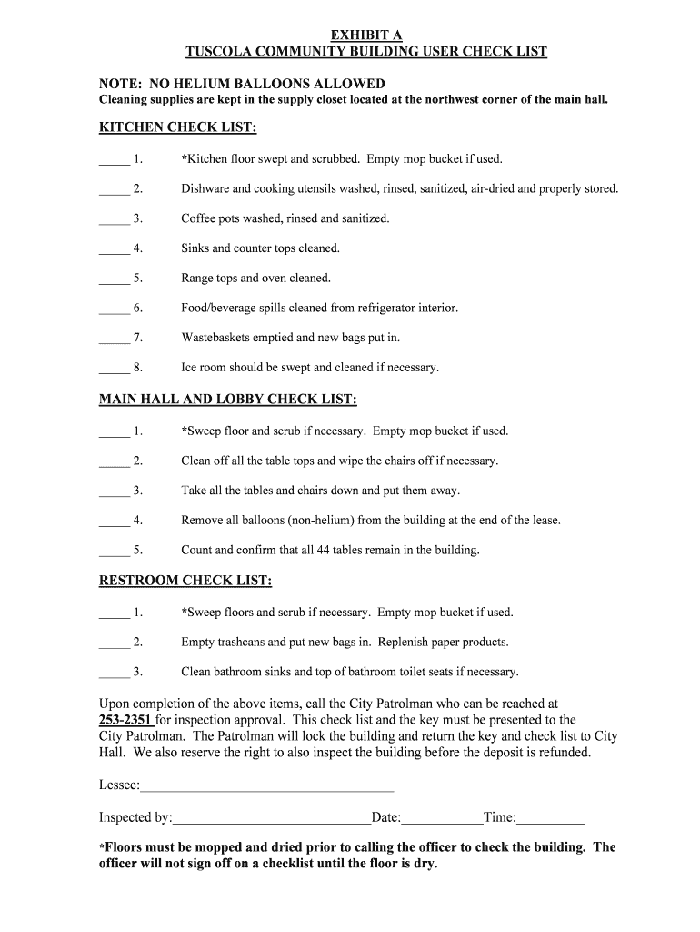 EXHIBIT A TUSCOLA COMMUNITY BUILDING USER CHECK LIST NOTE: NO HELIUM BALLOONS ALLOWED Cleaning supplies are kept in the supply closet located at the northwest corner of the main hall. KITCHEN CHECK