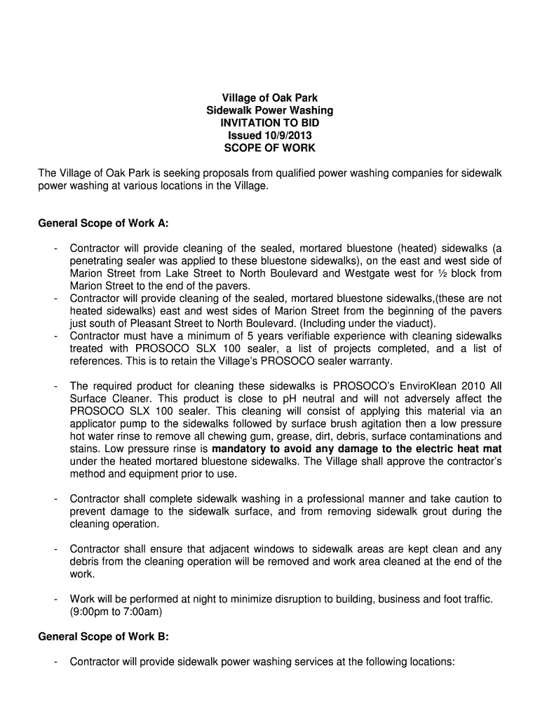 Village of Oak Park Sidewalk Power Washing INVITATION TO BID Issued 10/9/2013 SCOPE OF WORK The Village of Oak Park is seeking proposals from qualified power washing companies for sidewalk power washing