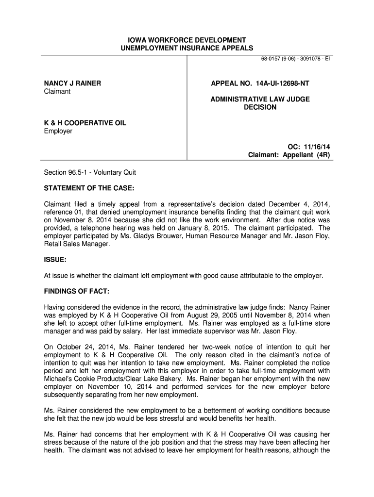 IOWA WORKFORCE DEVELOPMENT UNEMPLOYMENT INSURANCE APPEALS 680157 (906) 3091078 EI NANCY J TRAINER Claimant APPEAL NO. 14AUI12698NT ADMINISTRATIVE LAW JUDGE DECISION K & H COOPERATIVE OIL Employer