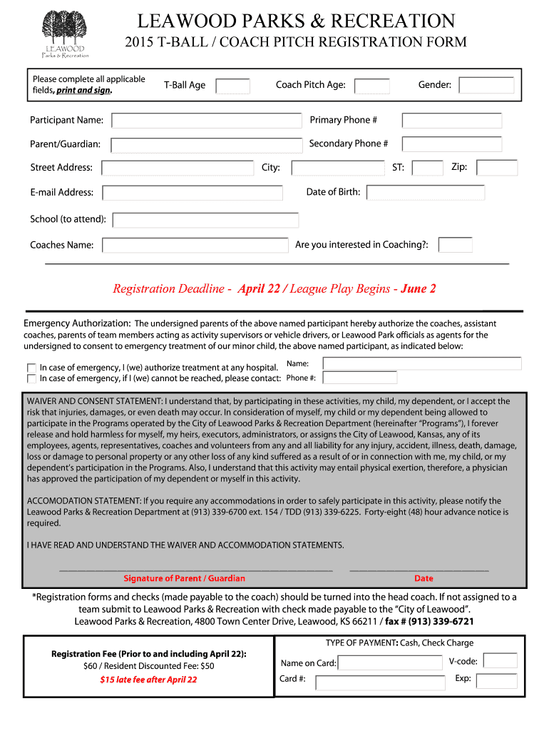 LEAWOOD PARKS & RECREATION 2015 BALL / COACH PITCH REGISTRATION FORM Please complete all applicable fields, print and sign. Ball Age Coach Pitch Age: Gender: Participant Name: Primary Phone # Parent/Guardian: