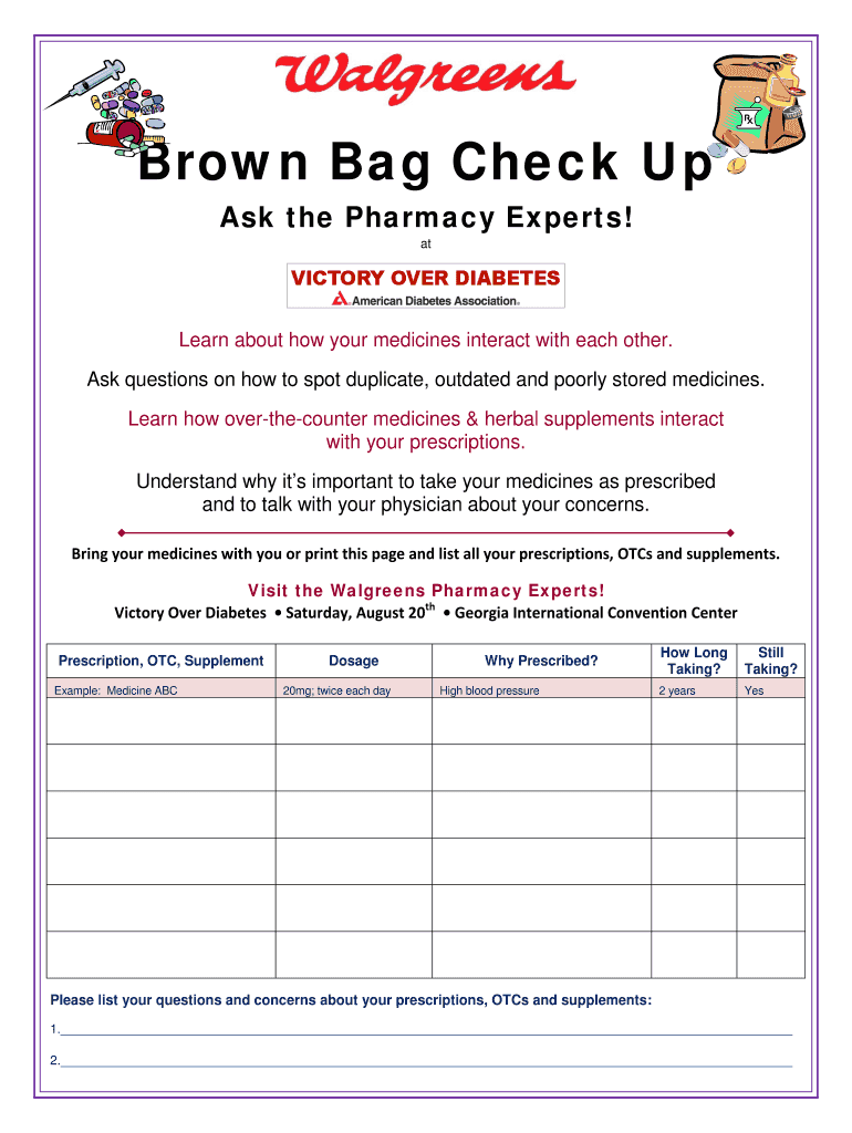 Brown Bag Check Up Ask the Pharmacy Experts! At Learn about how your medicines interact with each other. Ask questions on how to spot duplicate, outdated and poorly stored medicines. Learn how overthecounter
