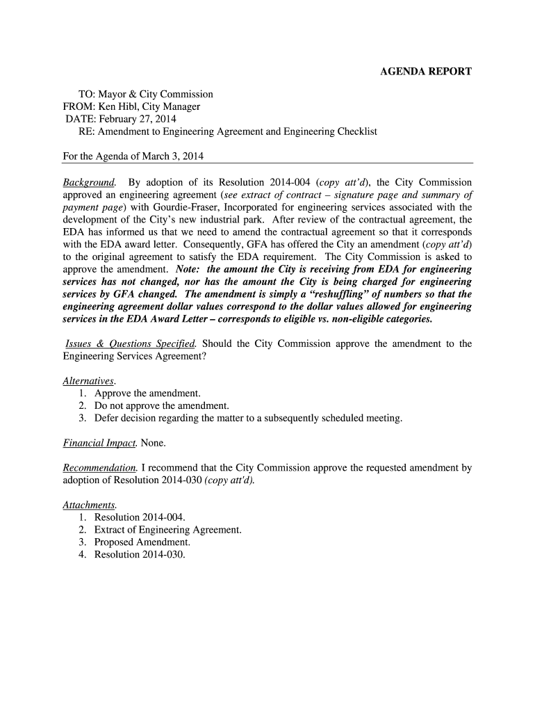 AGENDA REPORT TO: Mayor & City Commission FROM: Ken Hill, City Manager DATE: February 27, 2014, RE: Amendment to Engineering Agreement and Engineering Checklist For the Agenda of March 3, 2014, Background.
