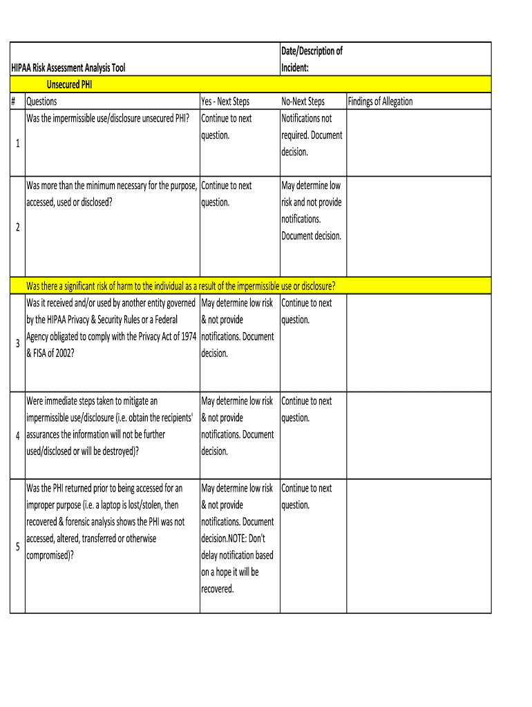 HIPAA Risk Assessment Analysis Tool Unsecured PHI # Questions Was the impermissible use/disclosure unsecured PHI? 1 Date/Description of Incident: Yes Next Steps Continue to next question. Was more