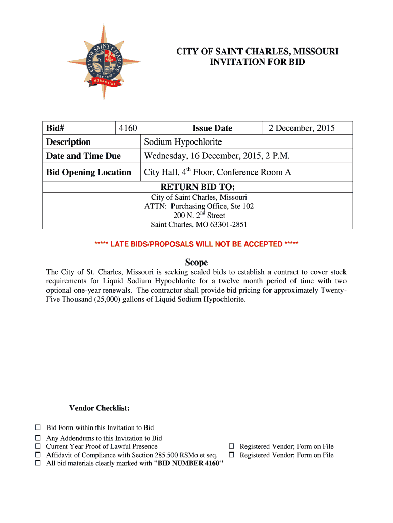 CITY OF SAINT CHARLES, MISSOURI INVITATION FOR BID# Description 4160 Issue Date Sodium Hypochlorite 2 December 2015 Date and Time Due Wednesday, 16 December, 2015:2 P.M. Bid Opening Location City