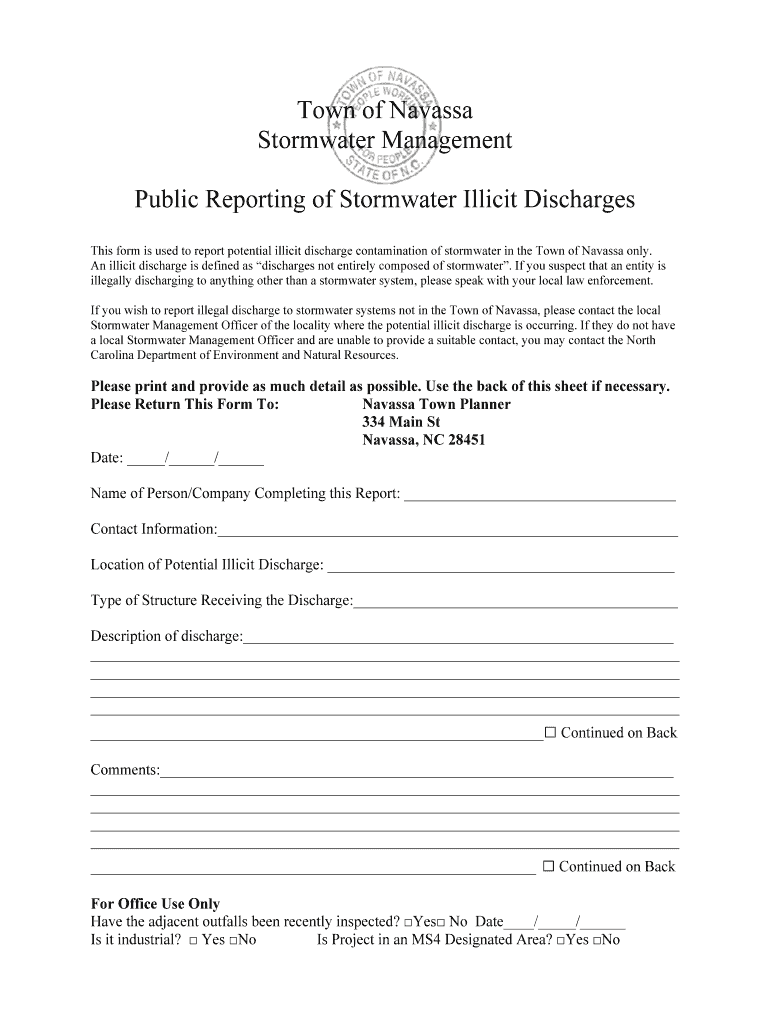 This form is used to report potential illicit discharge contamination of stormwater in the Town of Natasha only.