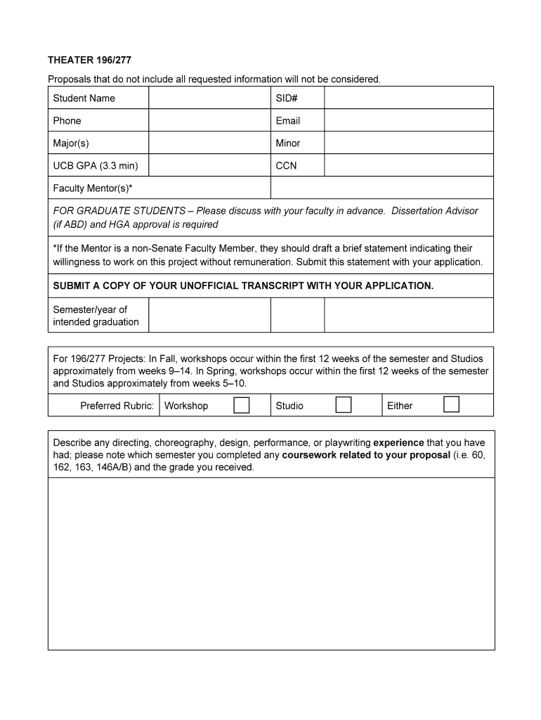 Application:Theater196/277 SingleSemesterWorkshoporStudioProduction Checklist: TDPS Major, MinororGraduateStudent UCBerkeleyMinimum3.3GPA FacultyMentorconfirmedaminimumoftwoweekspriortotheapplicationduedateitis
