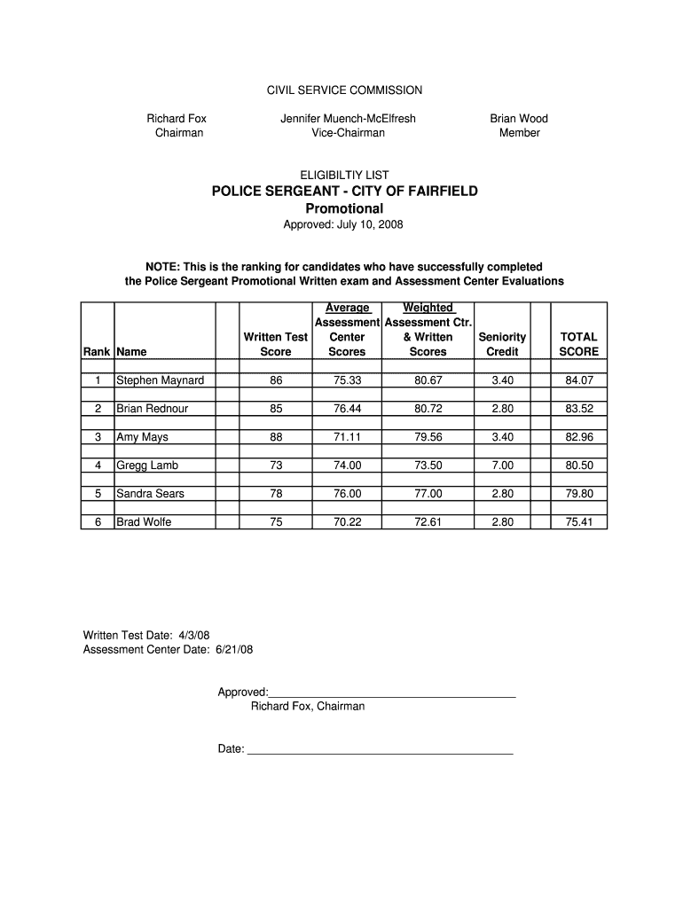 CIVIL SERVICE COMMISSION Richard Fox Chairman Jennifer MuenchMcElfresh ViceChairman Brian Wood Member ELIGIBILITY LIST POLICE SERGEANT CITY OF FAIRFIELD Promotional Approved: July 10, 2008, NOTE: