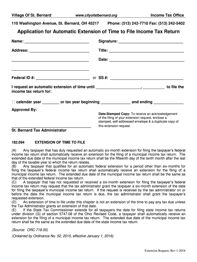 Village Of St. Bernard www.cityofstbernard.org 110 Washington Avenue, St. Bernard, OH 45217 Income Tax Office Phone: (513) 2427710 Fax: (513) 2425402 Application for Automatic Extension of Time to