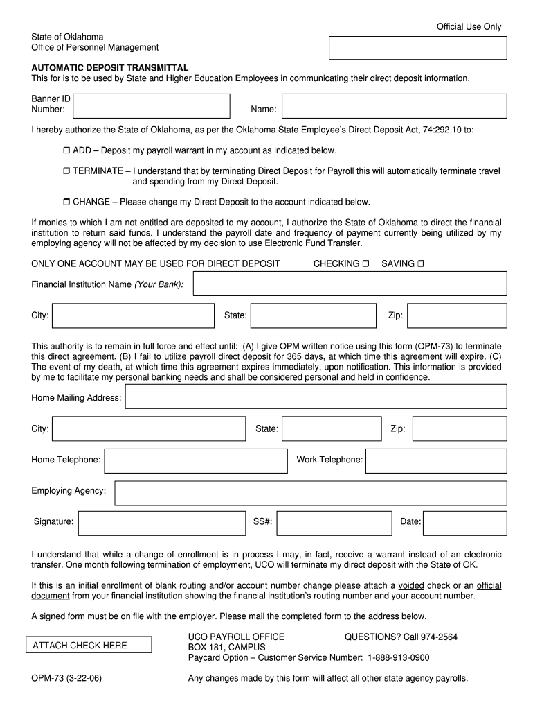 This form is to be used by State and Higher Education Employees in communicating their direct deposit information.