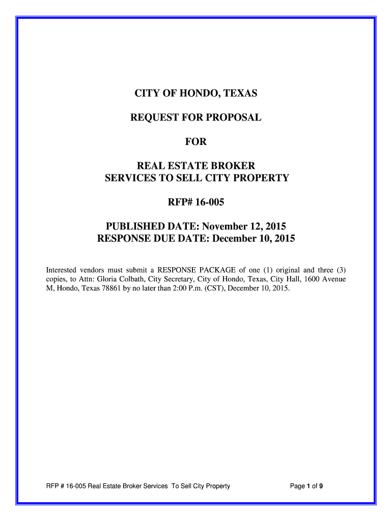CITY OF HONDA, TEXAS REQUEST FOR PROPOSAL FOR REAL ESTATE BROKER SERVICES TO SELL CITY PROPERTY RFP# 16005 PUBLISHED DATE: November 12, 2015, RESPONSE DUE DATE: December 10, 2015, Interested vendors