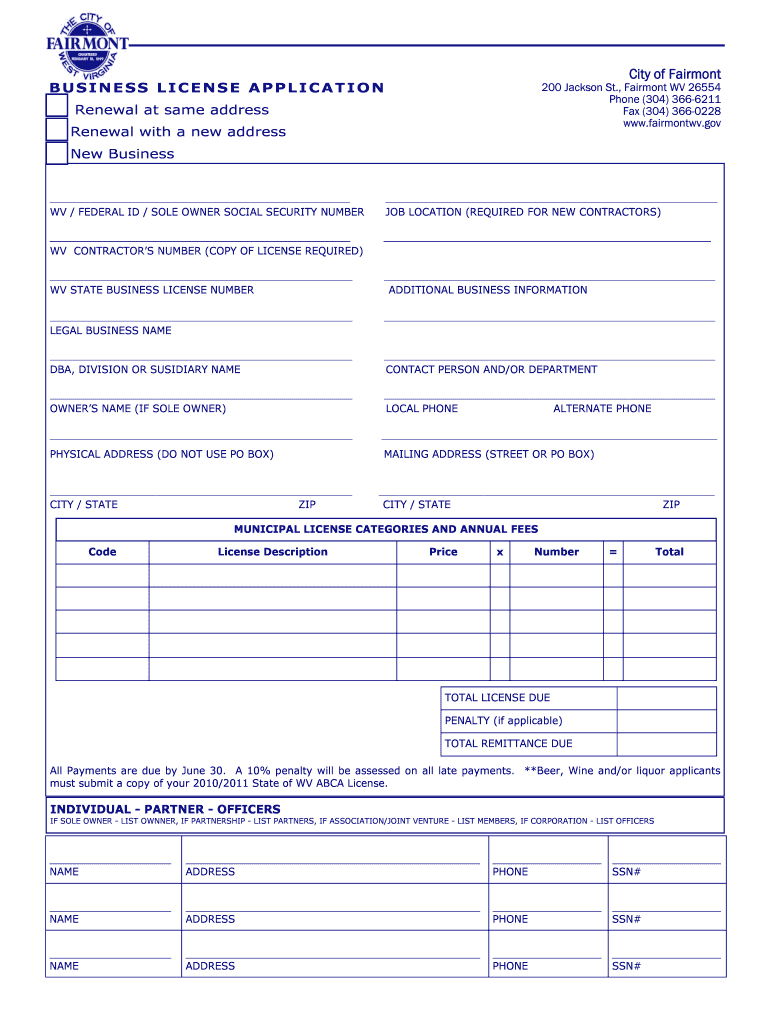 City of Fairmont BUSINESS LICENSE APPLICATION 200 Jackson St., Fairmont WV 26554 Phone (304) 3666211 Fax (304) 3660228 www.fairmontwv.gov Renewal at same address Renewal with a new address New Business