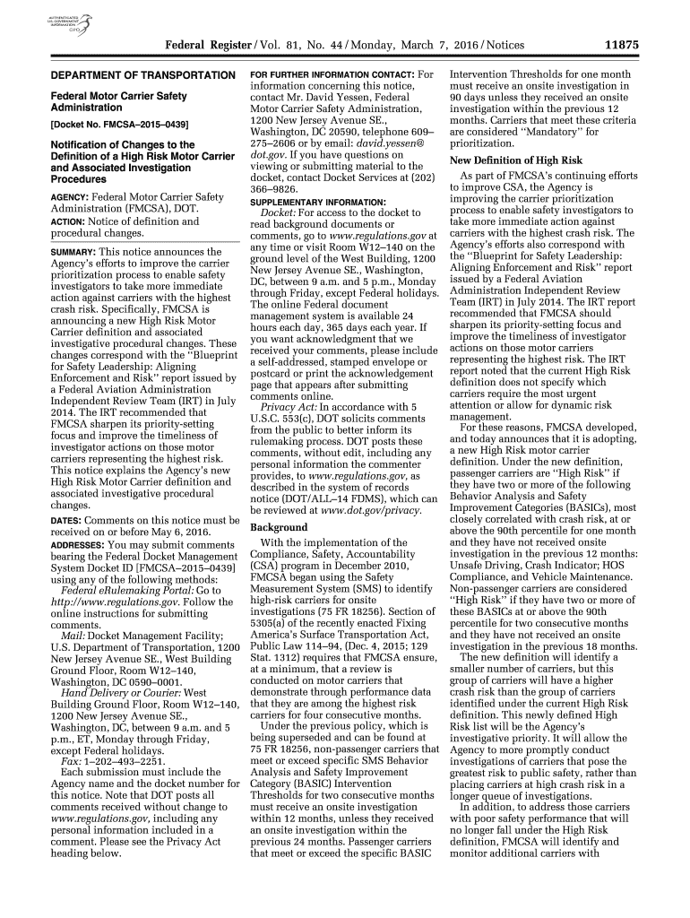 Federal Register / Vol. 81, No. 44 / Monday, March 7, 2016 / Notices DEPARTMENT OF TRANSPORTATION Federal Motor Carrier Safety Administration Docket No. FMCSA20150439 Notification of Changes to the