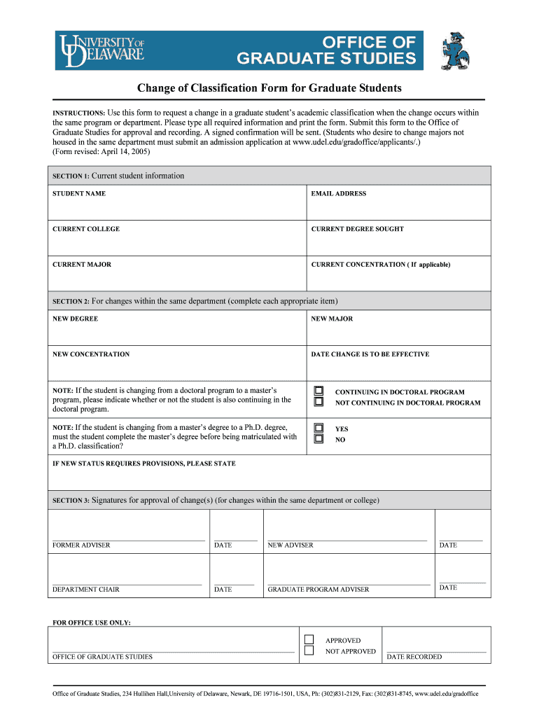 This form is used to request a change in a graduate student's academic classification within the same program or department at the University of Delaware.