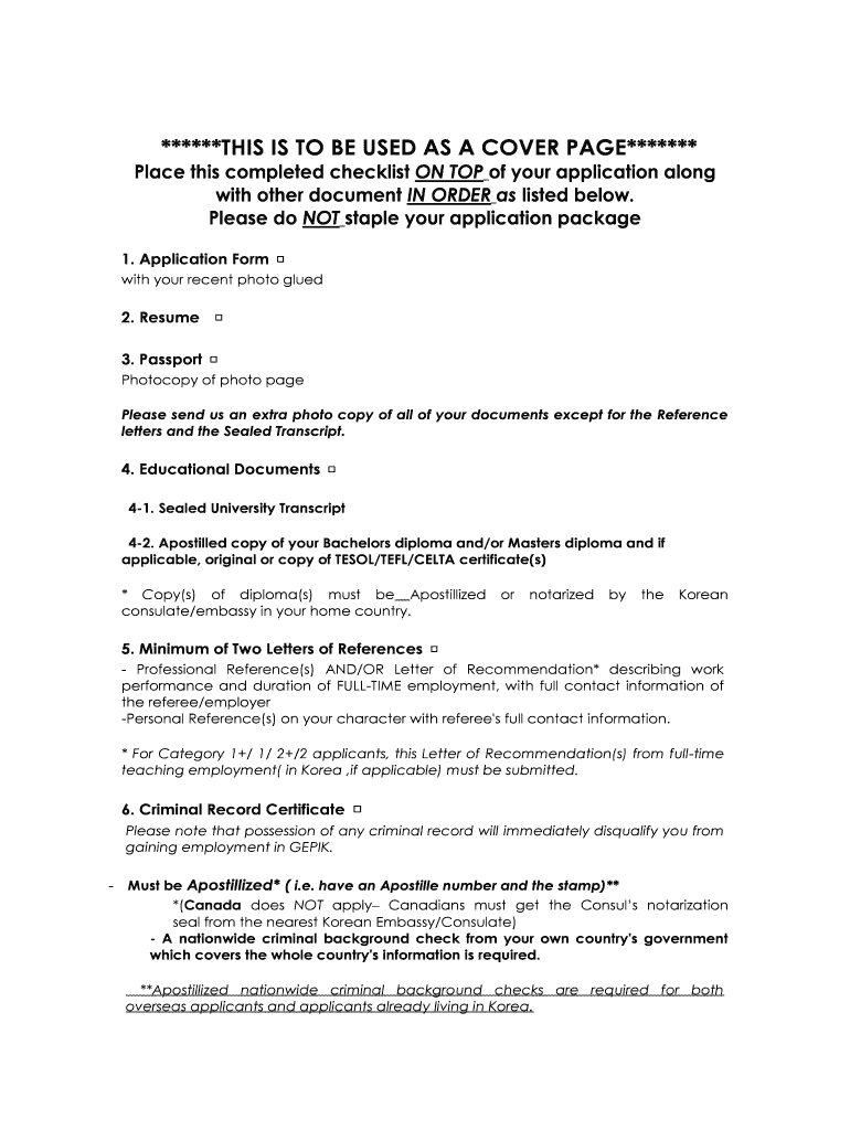 This document serves as a checklist to ensure that all necessary documents are submitted with the application to the GEPIK program, detailing what each section requires.