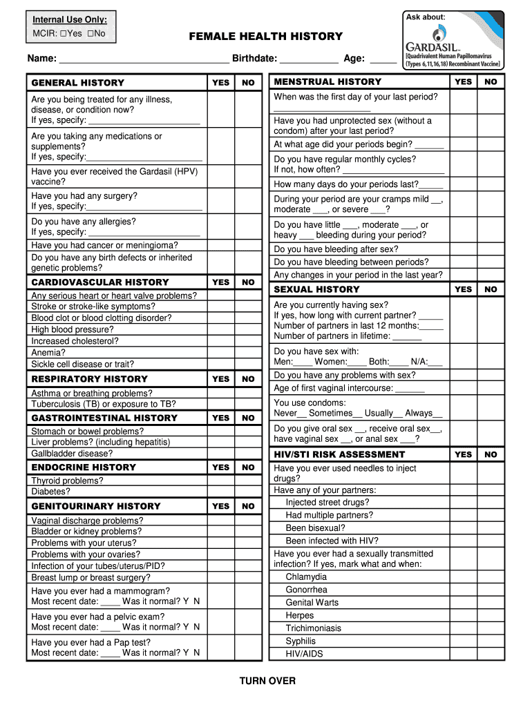 Internal Use Only: MIR: Yes No FEMALE HEALTH HISTORY Name: Birthdate: Age: GENERAL HISTORY YES NO MENSTRUAL HISTORY YES NO Do you have regular monthly cycles? If not, how often? How many days do your