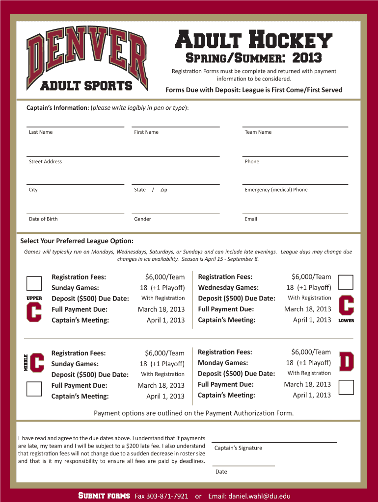 Adult Hockey Spring/Summer: 2013 Registration Forms must be complete and returned with payment information to be considered. Forms Due with Deposit: League is First Come/First Served Captain s Information: