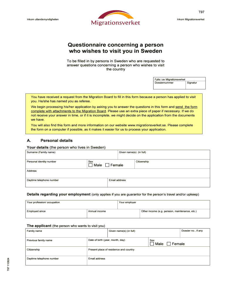 T97 Ink on utlandsmyndigheten Ink on Migrationsverket Questionnaire concerning a person who wishes to visit you in Sweden To be filled in by persons in Sweden who are requested to answer questions