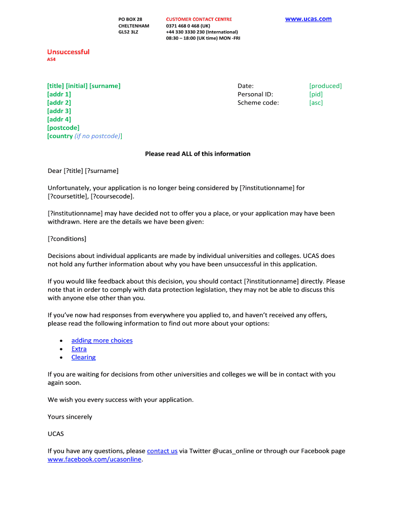 PO BOX 28 CHELTENHAM GL52 3LZ CUSTOMER CONTACT Center 0371 468 0 468 (UK) +44 330 3330 230 (International) 08:30 18:00 (UK time) MON FRI www.ucas.com Unsuccessful AS4 title initial surname add 1 add