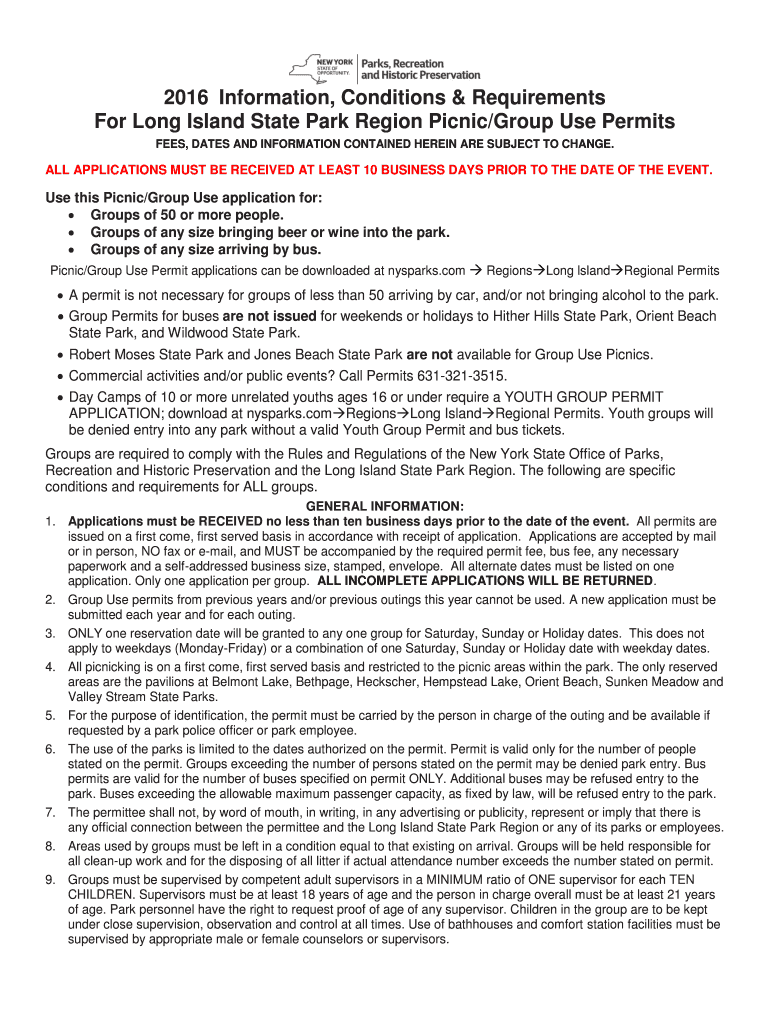 2016 Information, Conditions & Requirements For Long Island State Park Region Picnic/Group Use Permits FEES, DATES AND INFORMATION CONTAINED HEREIN ARE SUBJECT TO CHANGE. ALL APPLICATIONS MUST BE