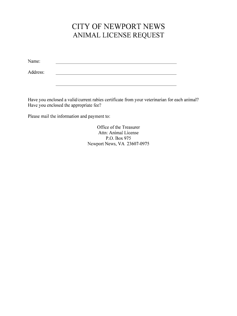 CITY OF NEWPORT NEWS ANIMAL LICENSE REQUEST Name: Address: Have you enclosed a valid/current rabies certificate from your veterinarian for each animal? Have you enclosed the appropriate fee? Please