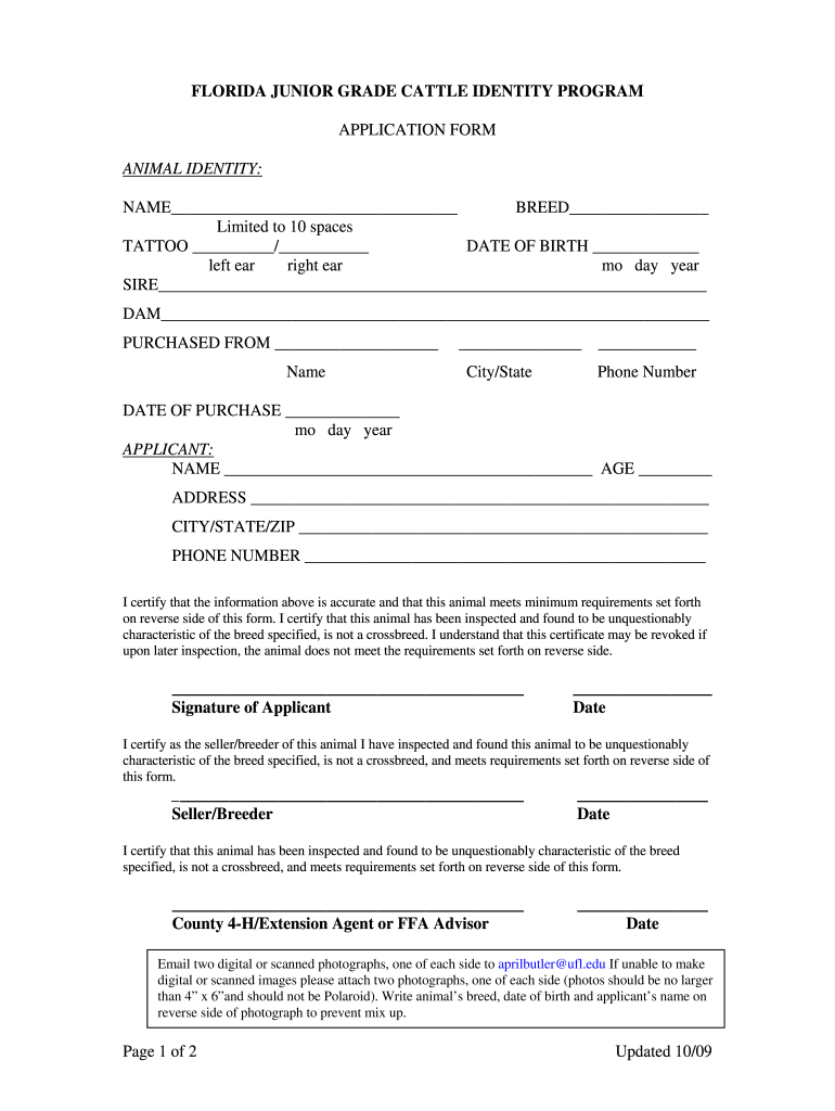 FL Junior Grade Cattle Identity Program Application 2009-2026 free printable template