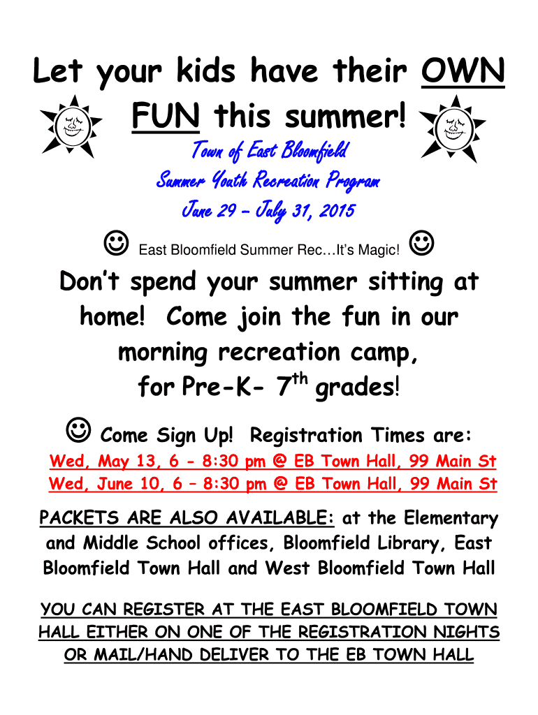 Let your kids have their OWN FUN this summer! Town of East Bloomfield Summer Youth Recreation Program June 29 July 31, 2015, East Bloomfield Summer Recite Magic! Don't spend your summer sitting at
