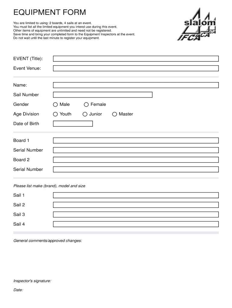 EQUIPMENT FORM. You are limited to using: 2 boards, 4 sails at an event. You must list all the limited equipment you intend use during this event.