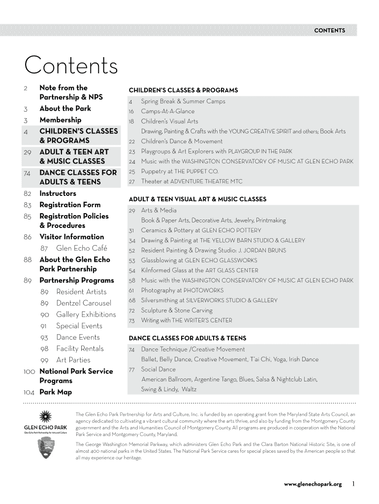 Content Contents Note from the Partnership & NPS 3 About the Park 3 Membership 4 Children's Classes & Programs 29 Adult & Teen Art & Music Classes 74 Dance Classes for Adults & Teens 82 Instructors