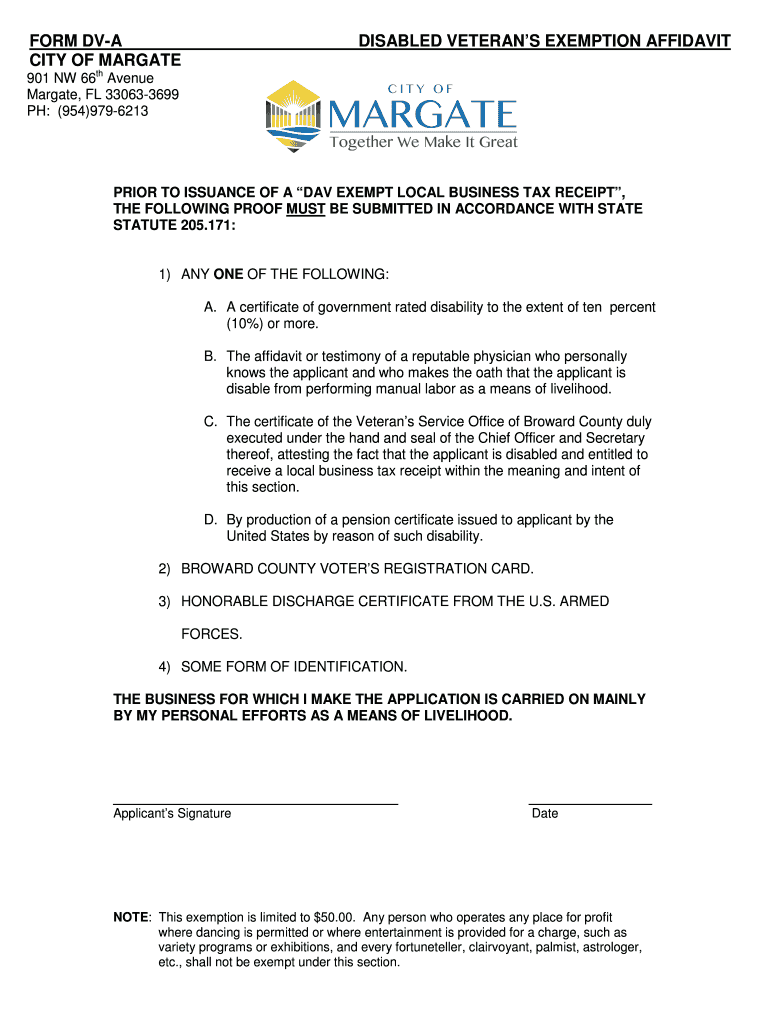 FORM DVA CITY OF MARGATE DISABLED VETERANS EXEMPTION AFFIDAVIT 901 NW 66th Avenue Margate, FL 330633699 PH: (954)9796213 PRIOR TO ISSUANCE OF A DAV EXEMPT LOCAL BUSINESS TAX RECEIPT, THE FOLLOWING