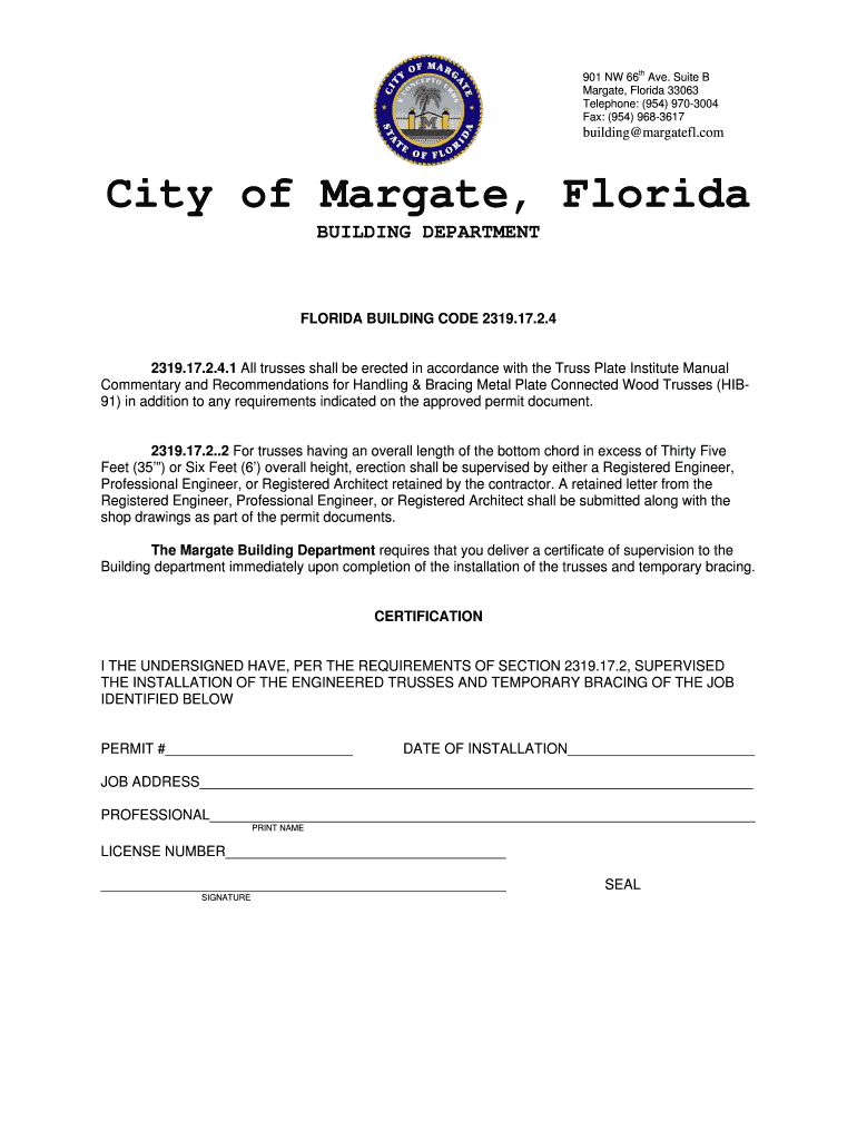 The 901 NW 66 Ave. Suite B Margate, Florida 33063 Telephone: (954) 9703004 Fax: (954) 9683617 building margatefl.com City of Margate, Florida BUILDING DEPARTMENT FLORIDA BUILDING CODE 2319.17.2.4
