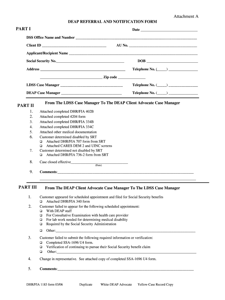 The DEAP Referral and Notification Form is a government document used by case managers to facilitate communication between local social services and the Disability Evaluation and Advocacy Program (DEAP).