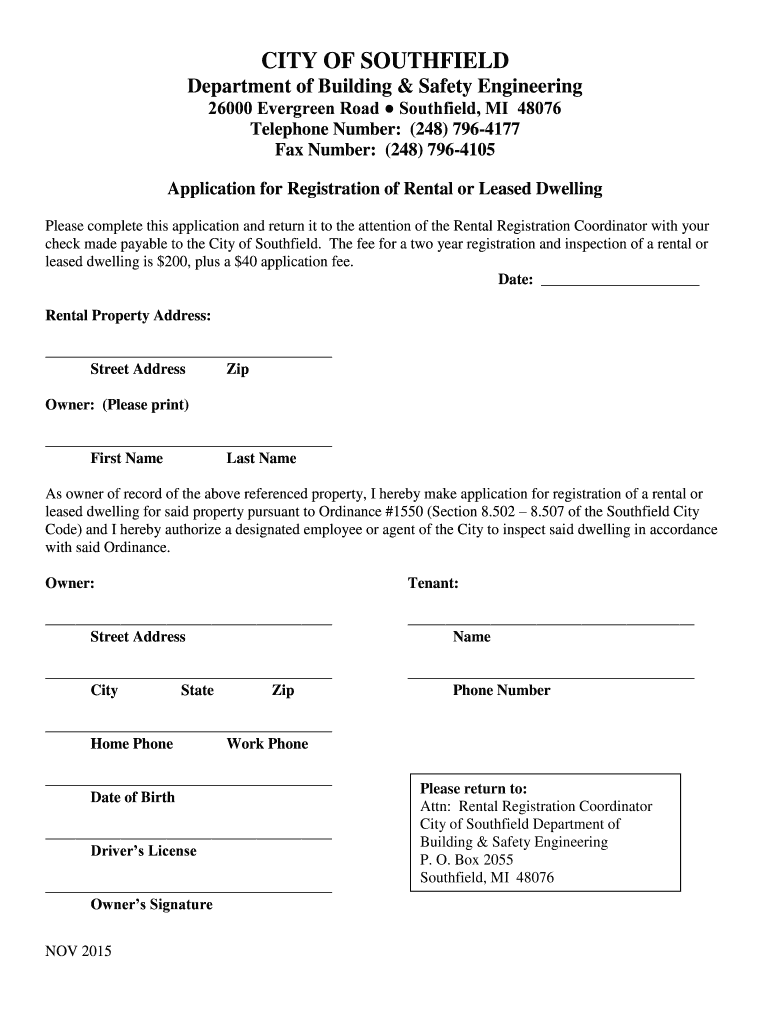 CITY OF SOUTHFIELD Department of Building & Safety Engineering 26000 Evergreen Road Southfield, MI 48076 Telephone Number: (248) 7964177 Fax Number: (248) 7964105 Application for Registration of Rental