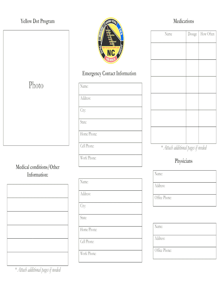 Yellow Dot Program Medications Name Photo Dosage How Often f Emergency Contact Information n Name: Address: City: State: Home Phone: Cell Phone: * Attach additional pages if needed t c s Work Phone: