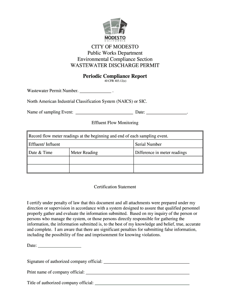 CITY OF MODESTO Public Works Department Environmental Compliance Section WASTEWATER DISCHARGE PERMIT Periodic Compliance Report 40 CFR 403.12(e) Wastewater Permit Number. . North American Industrial