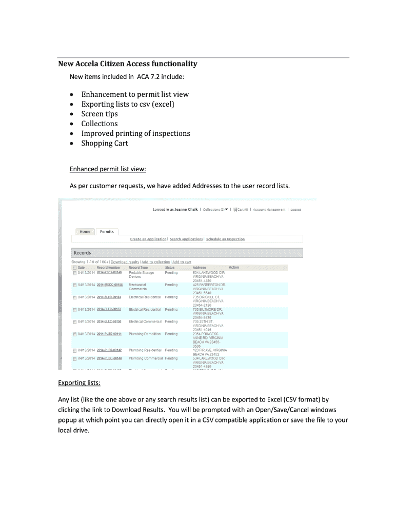 New Accela Citizen Access functionality New items included in ACA 7.2 include: Enhancement to permit list view Exporting lists to CSV (excel) Screen tips Collections Improved printing of inspections