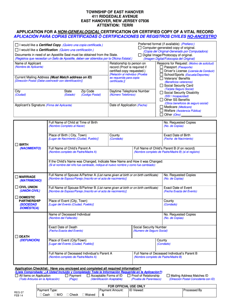 TOWNSHIP OF EAST HANOVER 411 RIDGED ALE AVENUE EAST HANOVER, NEW JERSEY 07936 ATTENTION: TERRI APPLICATION FOR A GENEALOGICAL CERTIFICATION OR CERTIFIED COPY OF A VITAL RECORD APPLICATION PARA COPIES