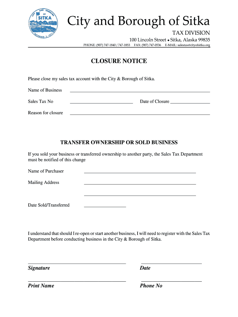 City and Borough of Site TAX DIVISION 100 Lincoln Street Site, Alaska 99835 PHONE: (907) 7471840 / 7471853 Faxes: (907) 7470536 EMAIL: sales tax cityofsitka.org CLOSURE NOTICE Please close my sales