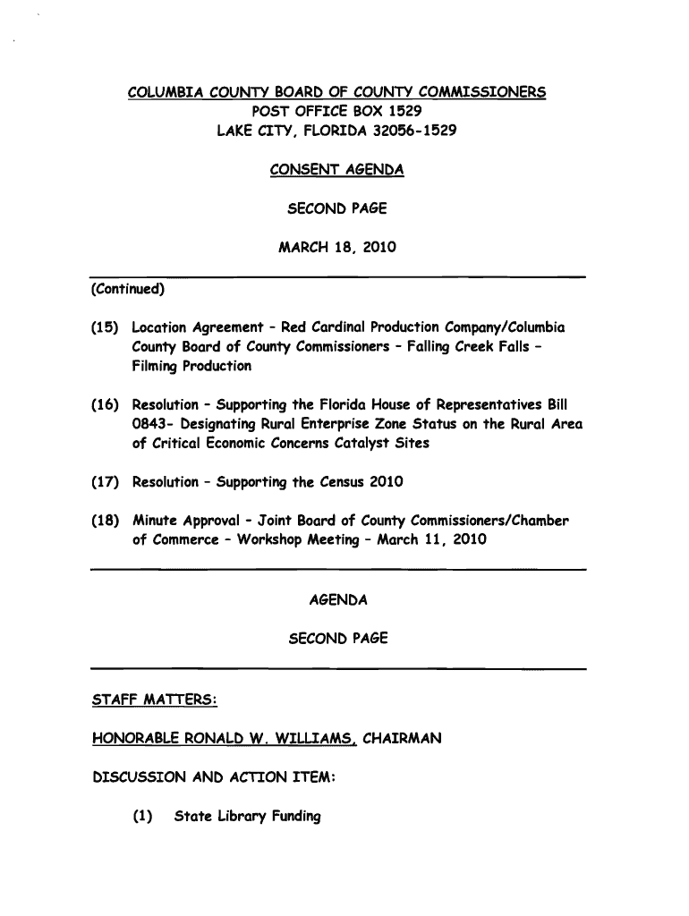 COLUMBIA COUNTY BOARD OF COUNTY COMMISSIONERS POST OFFICE BOX 1529 LAKE CITY, FLORIDA 320561529 CONSENT AGENDA SECOND PAGE MARCH 18, 2010 (Continued) Location Agreement Red Cardinal Production Company/Columbia