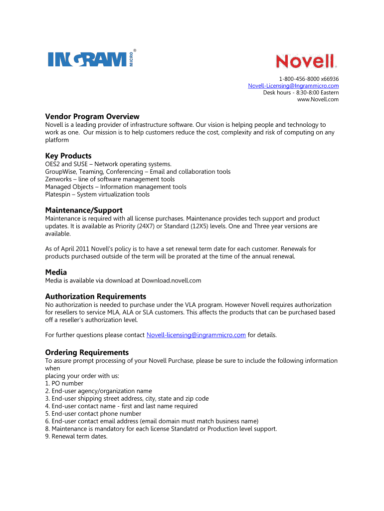 1-800-456-8000 x66936 Novell-Licensing Ingrammicro.com Desk hours 8:30-8:00 Eastern www.Novell.com Vendor Program Overview Novel is a leading provider of infrastructure software. Our vision is helping